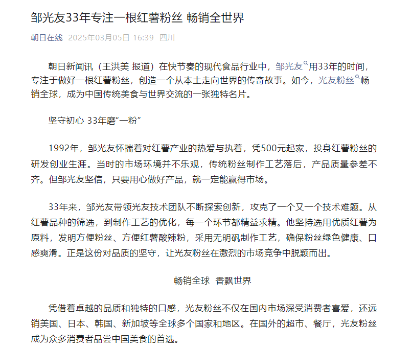 轉(zhuǎn)載朝日在線(xiàn)——鄒光友33年專(zhuān)注一根紅薯粉絲 暢銷(xiāo)全世界