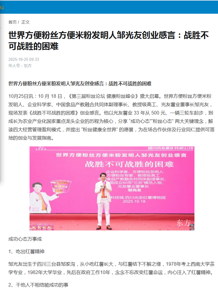 世界方便粉絲方便米粉發(fā)明人鄒光友創(chuàng)業(yè)感言:戰(zhàn)勝不可戰(zhàn)勝的困難